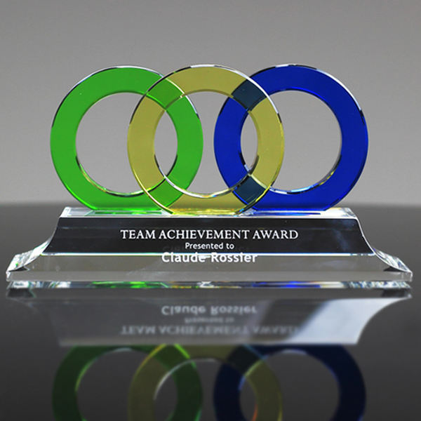 Trophée en cristal à trois anneaux pour les récompenses des institutions éducatives et des projets communautaires
