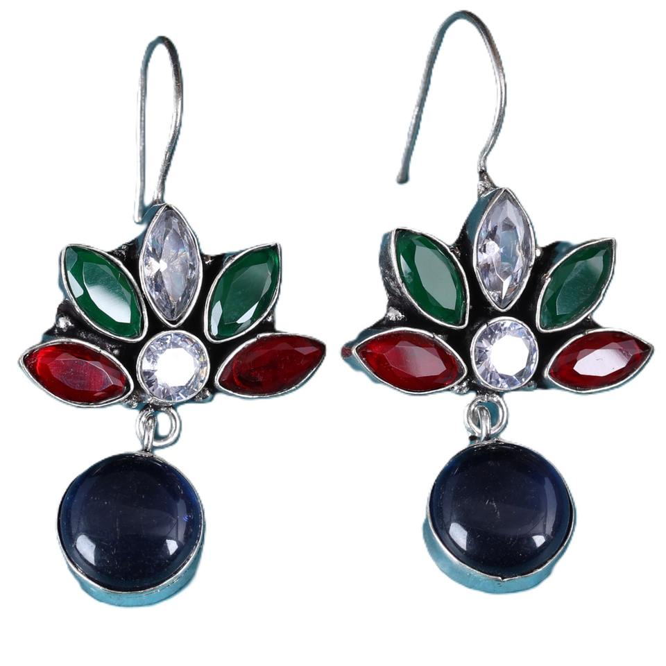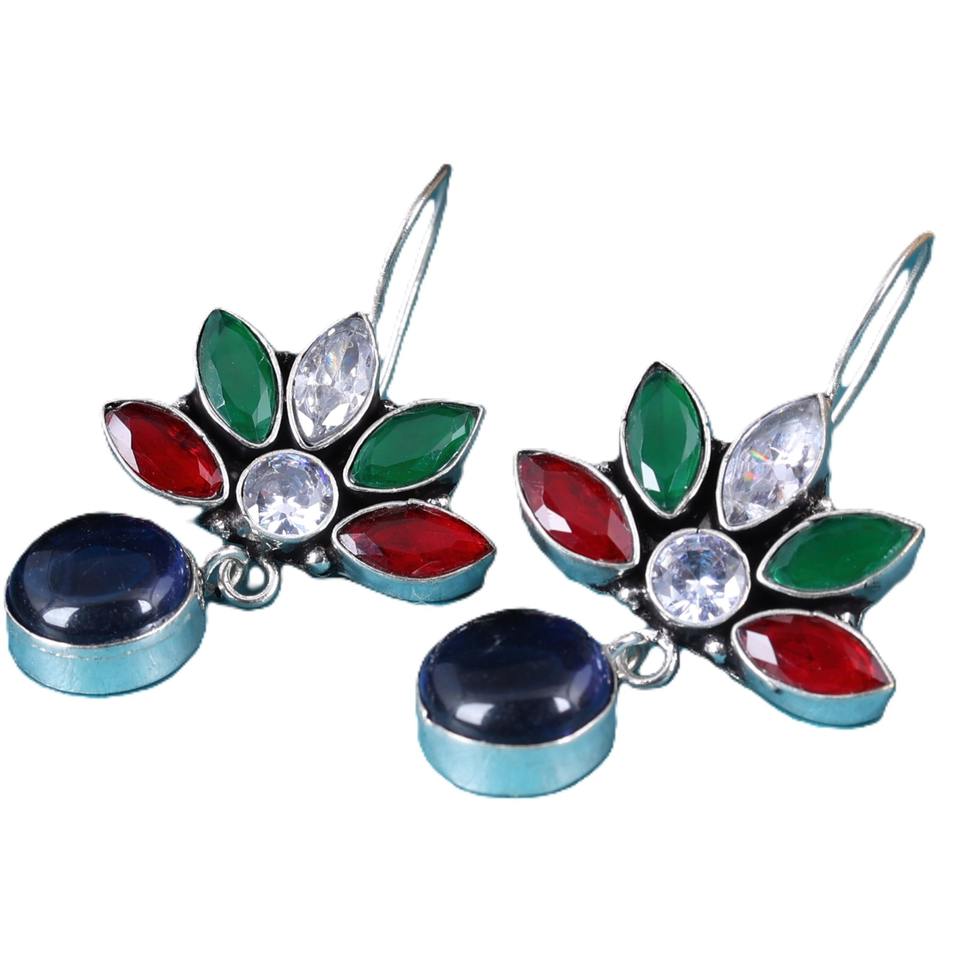 Boucles d'oreilles créoles multicolores tendance style tribal bohème | Boucles d'oreilles pendantes ethniques en argent oxydé avec zircon pour femmes