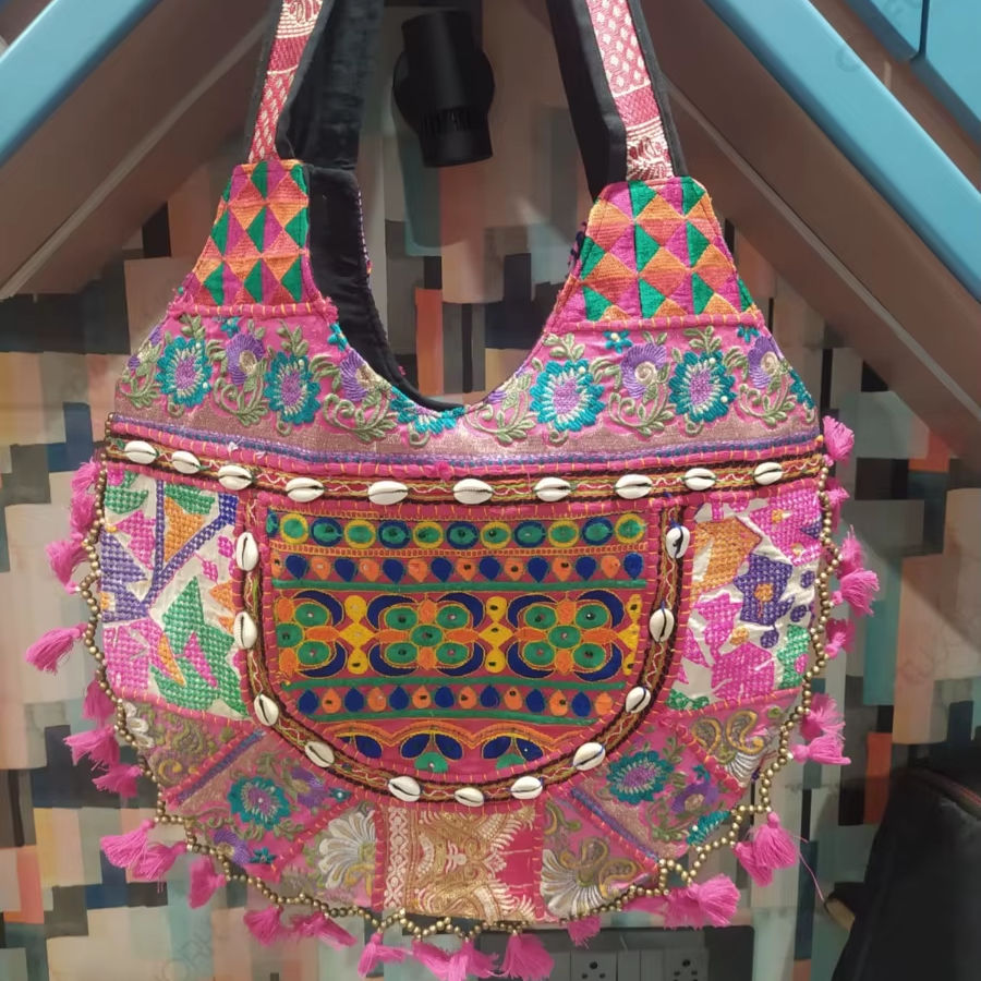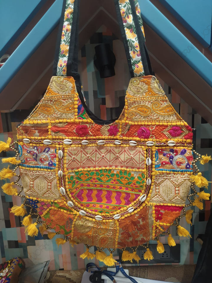 Sac fourre-tout brodé patchwork tribal, sac à bandoulière bohème, sac à main artisanal en textile avec coquillages et pompons pour femme