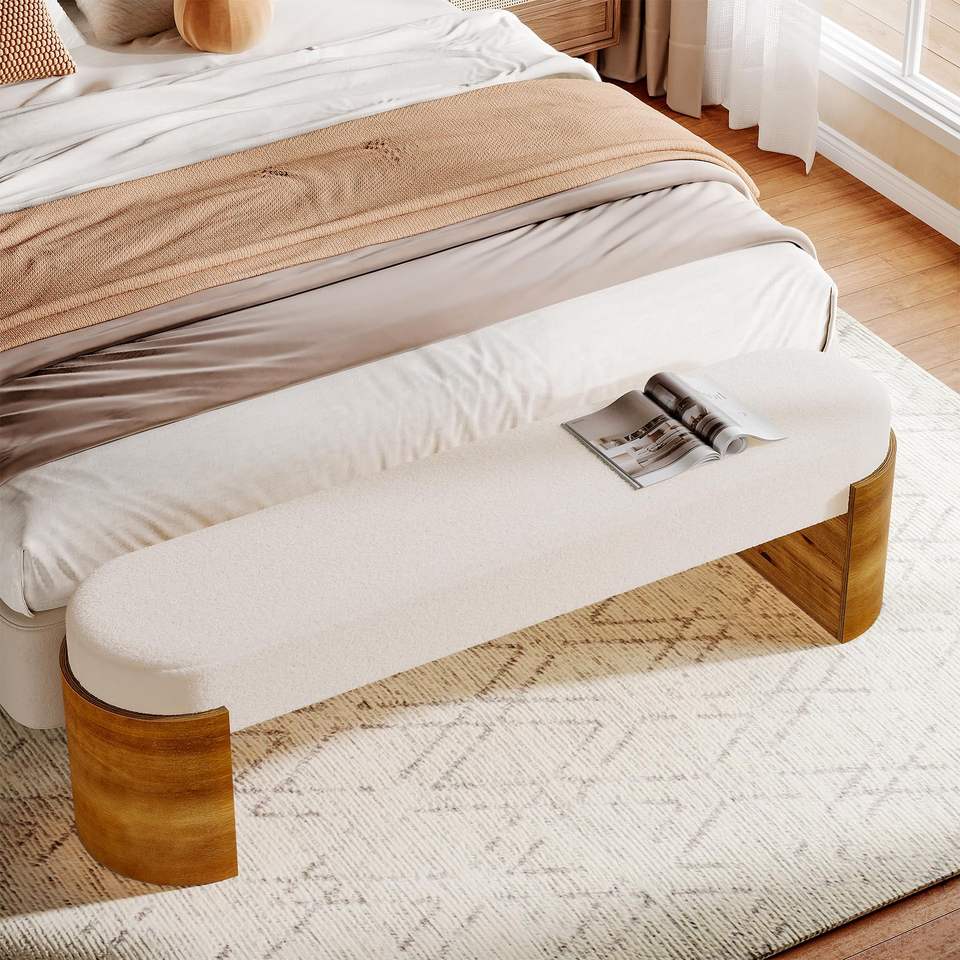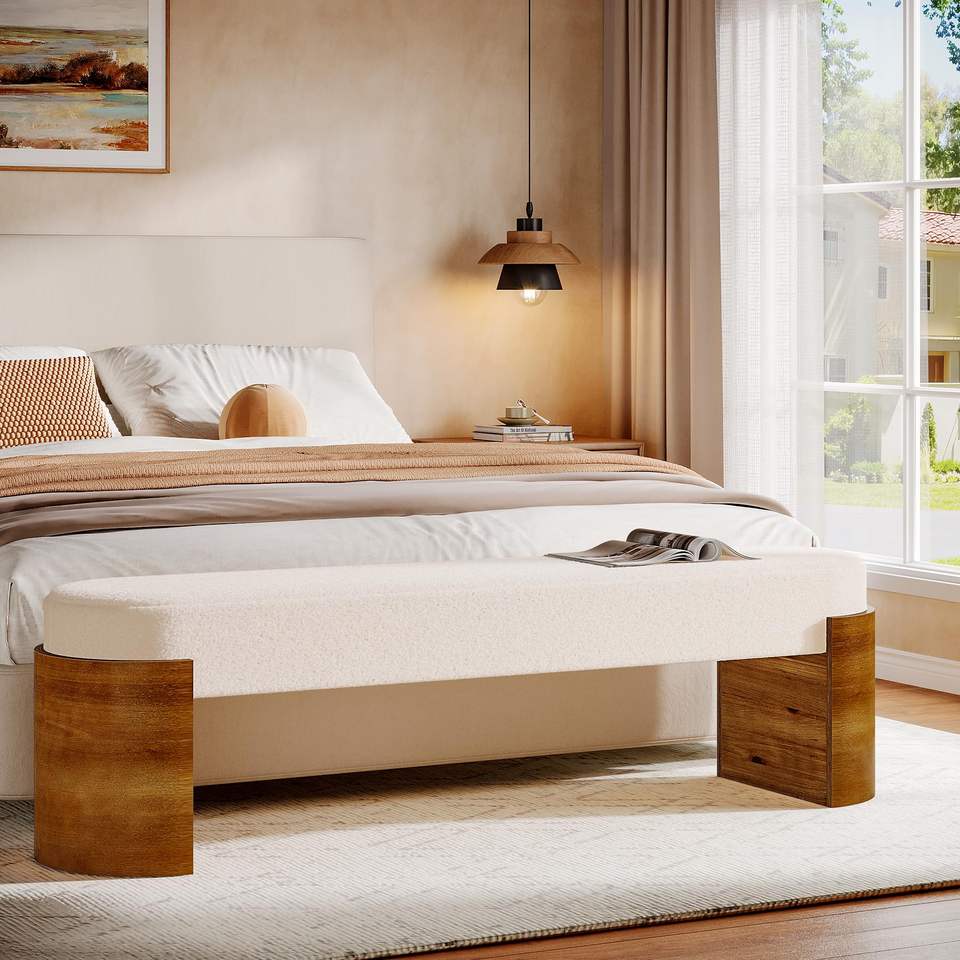 Banc de chambre principale Tribesigns 59 pouces, ottoman pour le pied du lit avec siège en fausse fourrure d'agneau et structure en bois d'ingénierie, blanc et marron