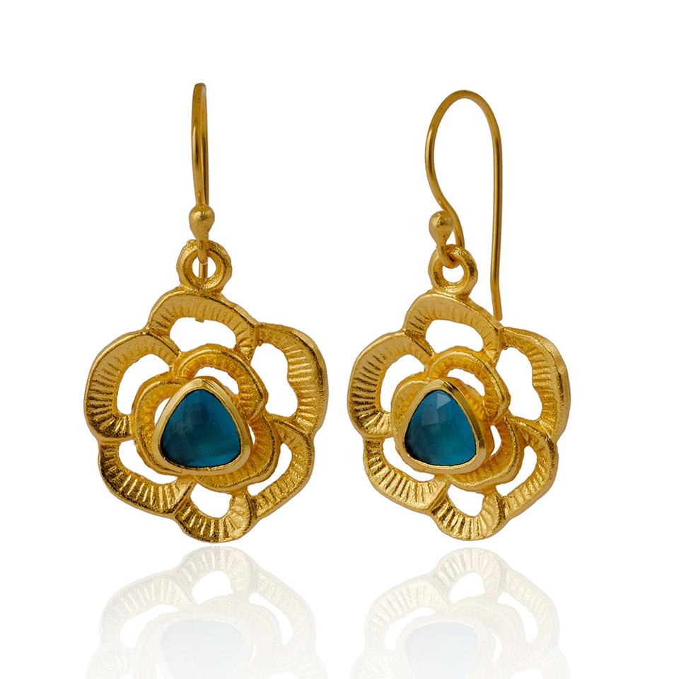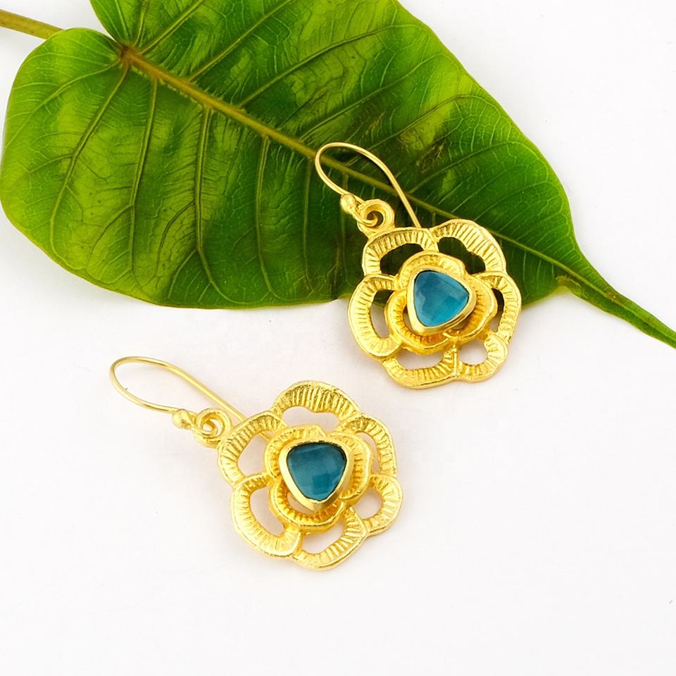 Boucles d'oreilles pendantes en calcédoine bleue en forme de trillion plaqué or avec crochet de texture bijoux de mode