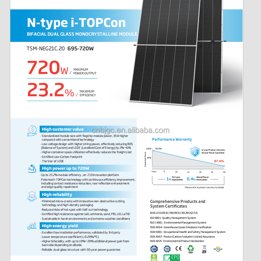 Panneau solaire Trina 700W 705W 710W 715W 720W Modules solaires de haute qualité Panneaux solaires mono Type N avec double panneau solaire en verre