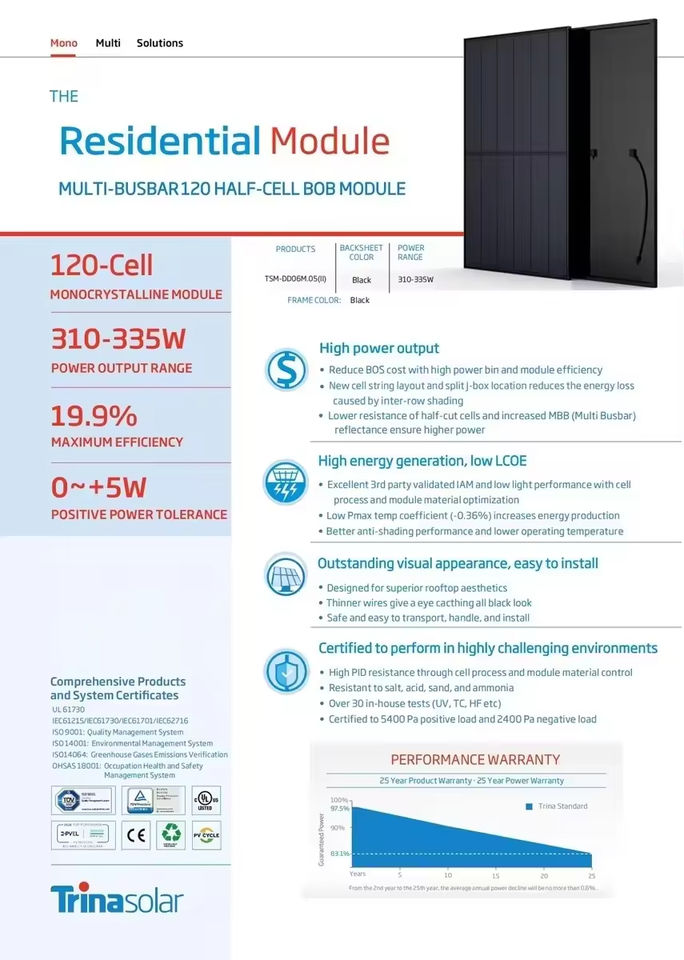 Module résidentiel Trinasolar Multi-Busbar 120 demi-cellules Bob à cadre noir 310W-335W, panneaux solaires bifaciaux double vitrage 19,9%