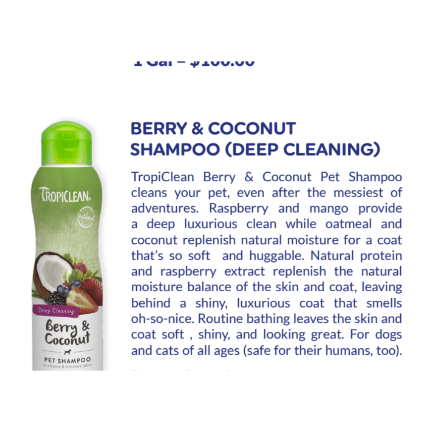 Shampoo pour animaux de compagnie TropiClean aux baies et à la noix de coco (nettoyage en profondeur) 1 gallon