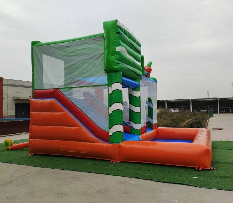 Château gonflable commercial sur le thème des poissons tropicaux avec zone de rebond, toboggan et piscine étanche