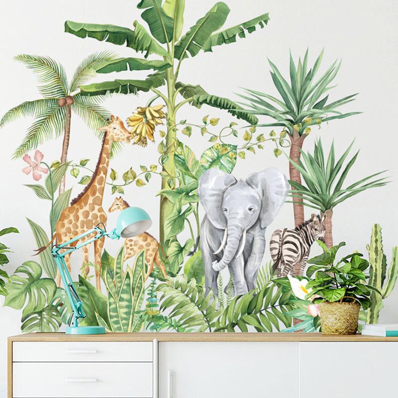 Autocollants muraux de salle en vinyle, avec des animaux de forêt tropicale, éléphant, palmier 3d
