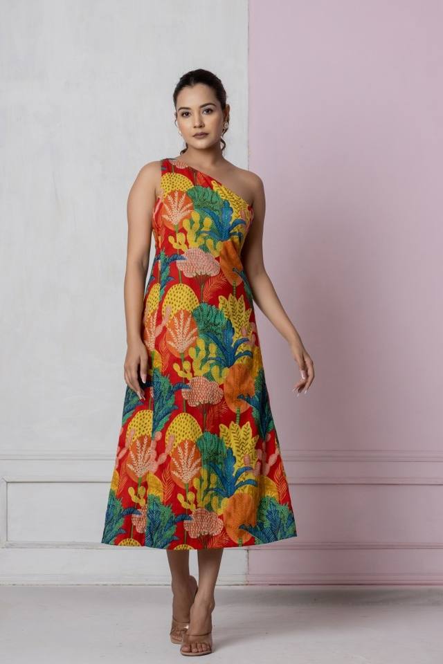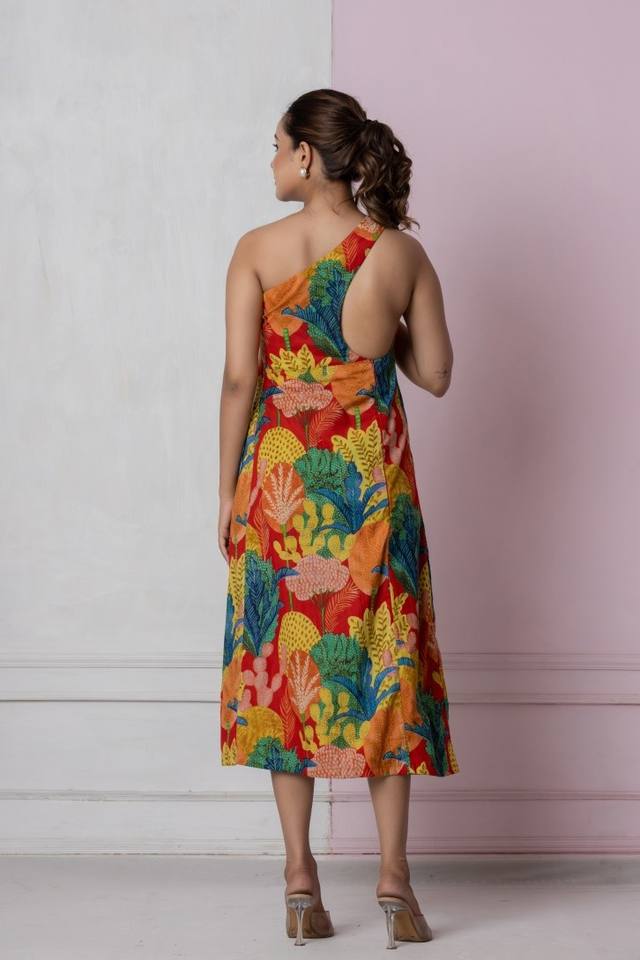 Robe longue asymétrique tropicale à imprimé feuilles, 100 % coton, coupe décontractée trapèze, motifs inspirés de la jungle, dos ouvert élégant, lavable