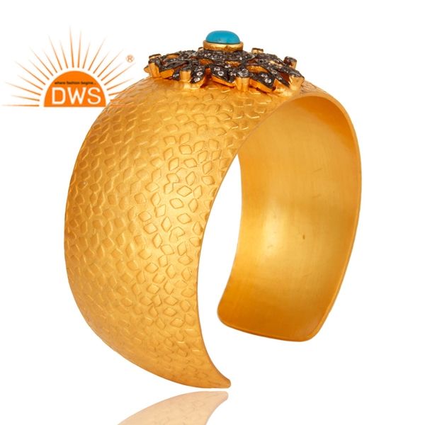 Vraiment belle déclaration en laiton manchette bracelet mode bijoux fournisseur CZ Turquoise pierres précieuses manchette Bracelet Vintage Collection