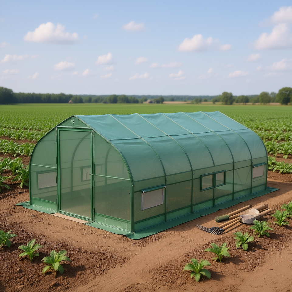 Serre tunnel 10 x 20 avec couverture en toile ripstop Leno, toit en pente et fenêtres enroulables pour usage agricole