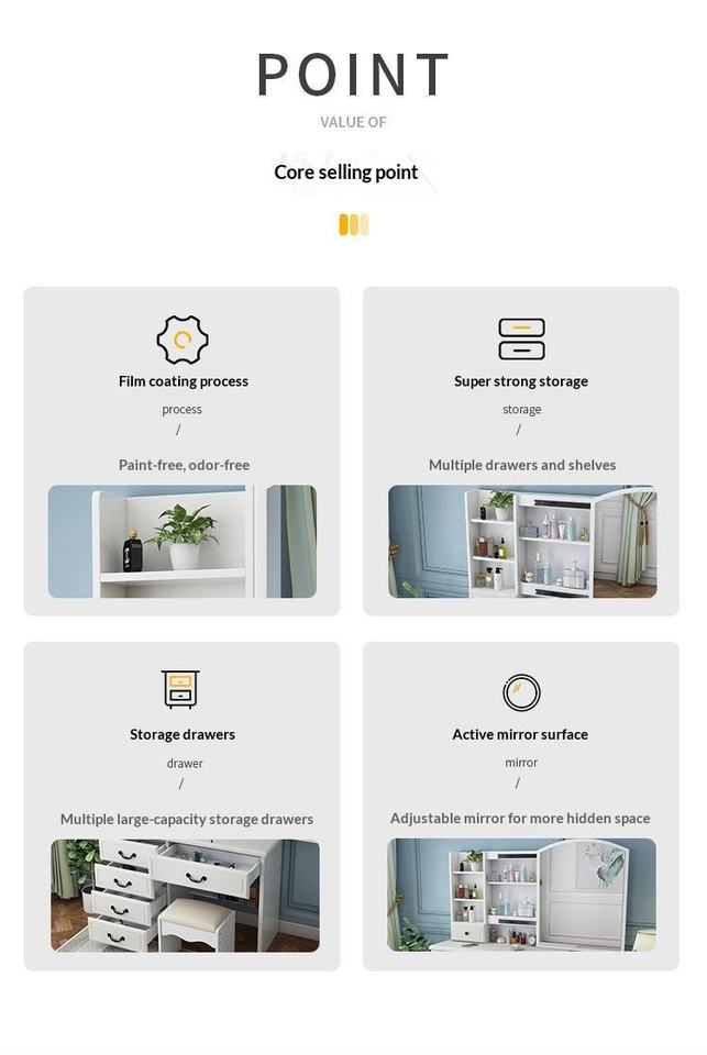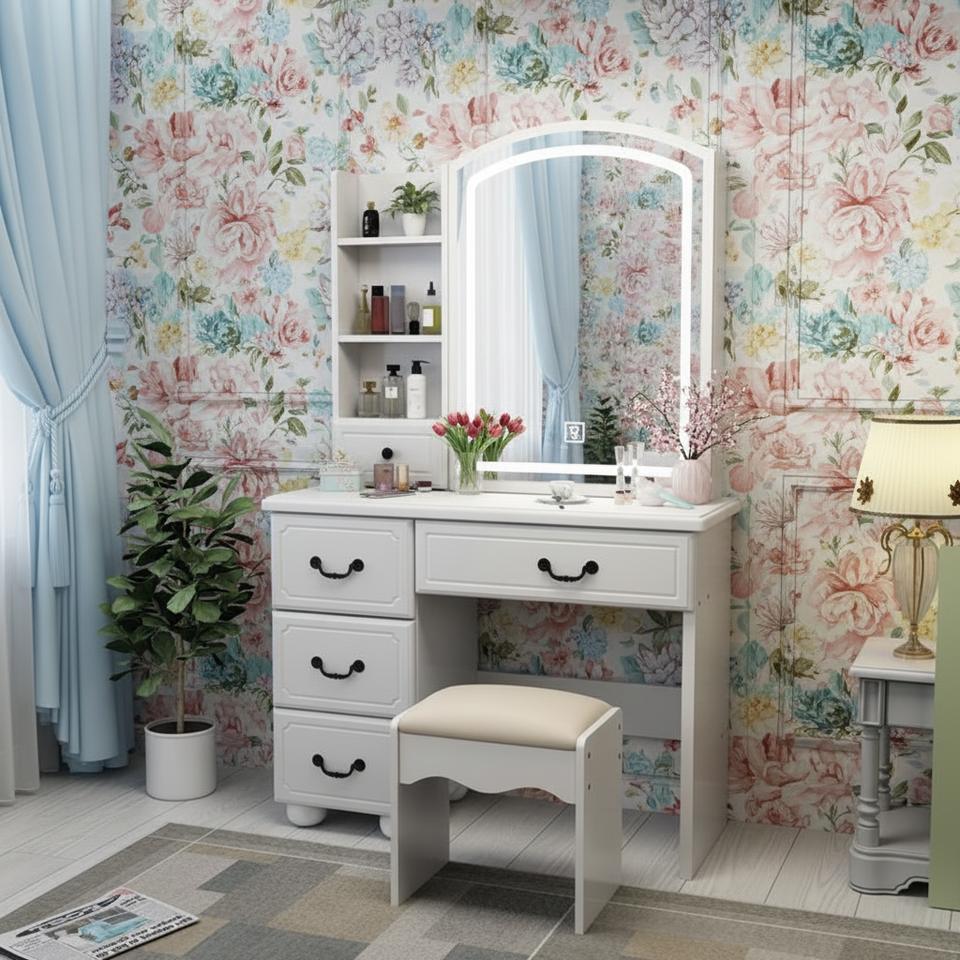 Tuochen Miroir LED moderne réglable amovible avec tiroirs de rangement en bois massif, port USB, coiffeuse compacte