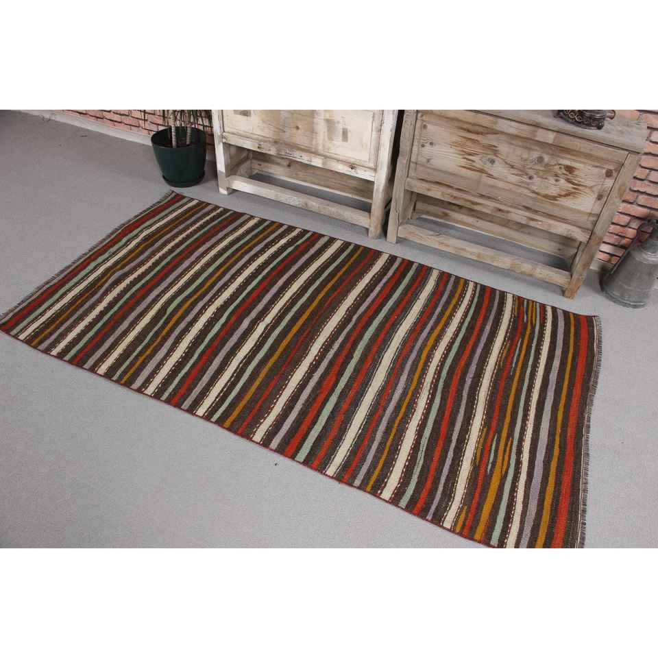 Tapis turc 3,37 x 6,3 pieds, tapis Kilim vintage, tapis en laine marron à motifs de plantes et d'arbres