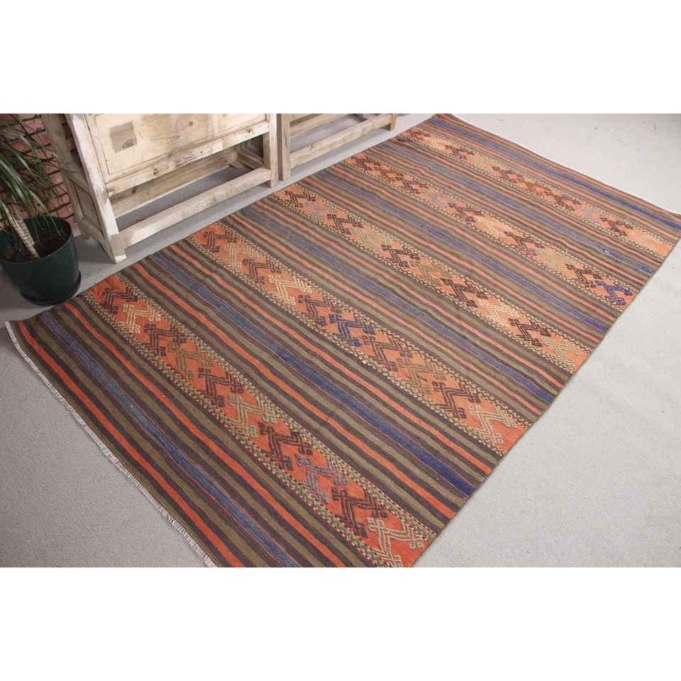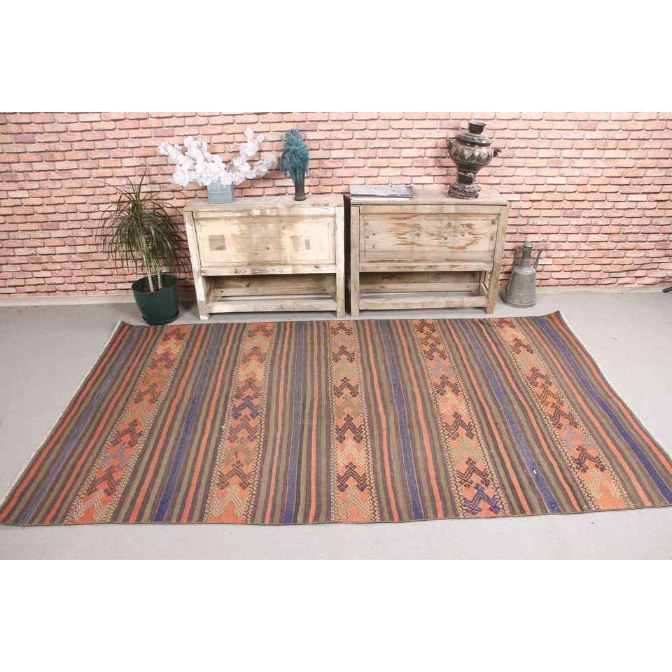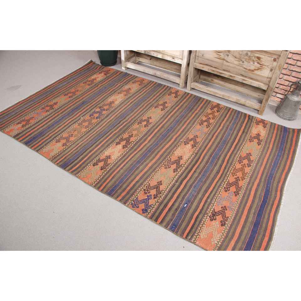 Tapis turc 4,6x7,9 pieds, tapis en laine vintage Kilim rayé orange