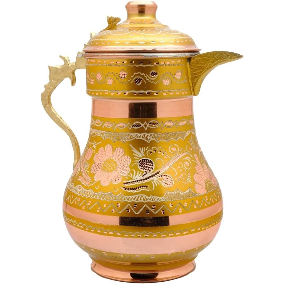Turkish-Engraved Design Copper Water Jug Polished Metal Ayurveda Doctor's Pitcher with Handle