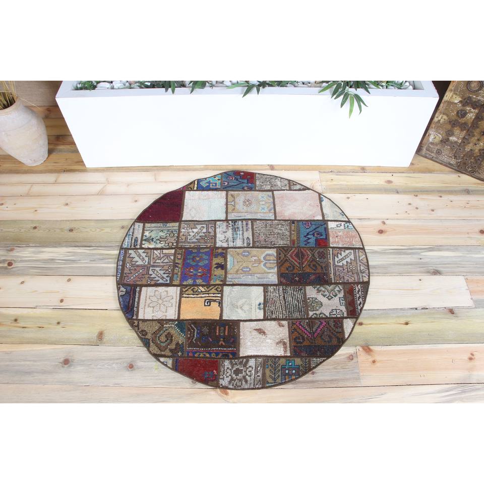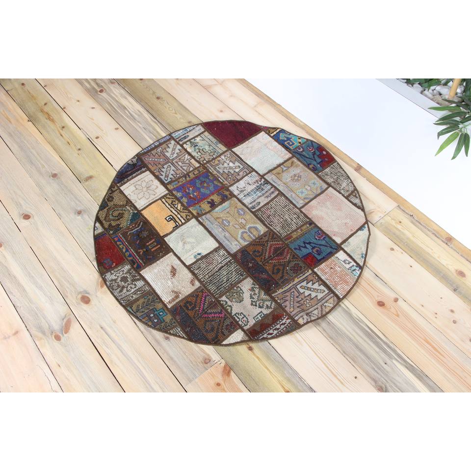 Tapis rond turc, tapis vintage 3,3x3,3 pieds, tapis en laine marron à motifs floraux