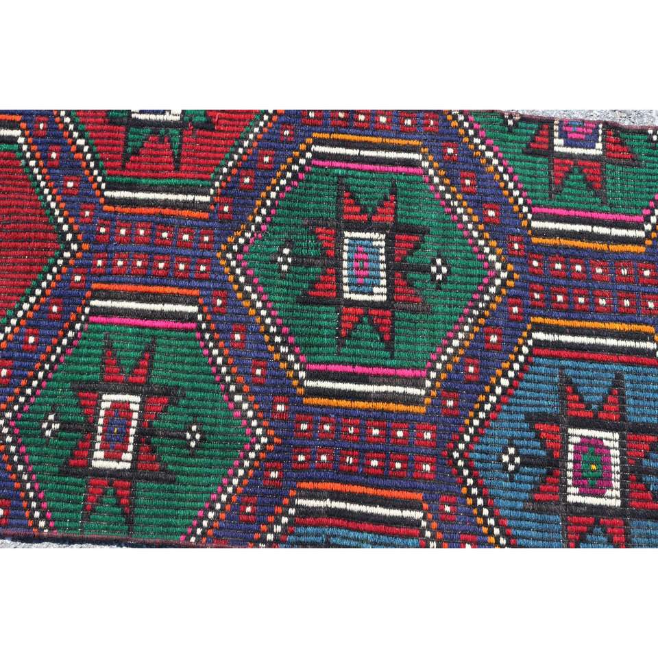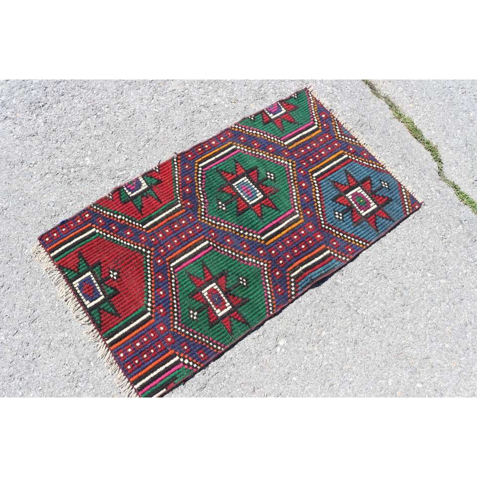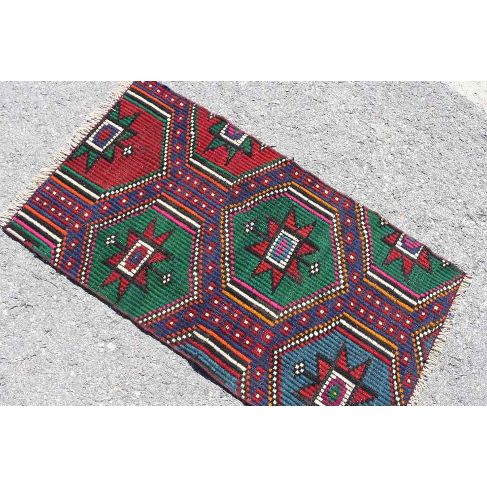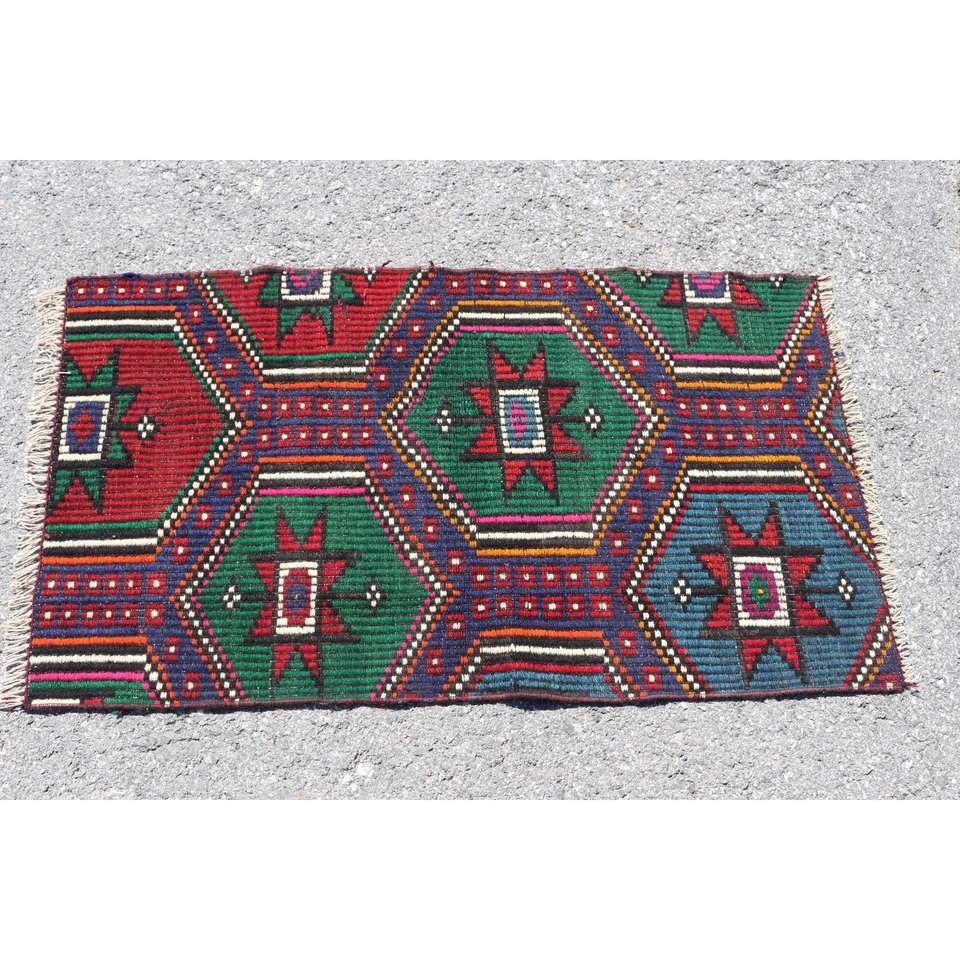 Tapis turc, petit tapis vintage 2,1x3,7 pieds, tapis Kilim patchwork rouge et bleu