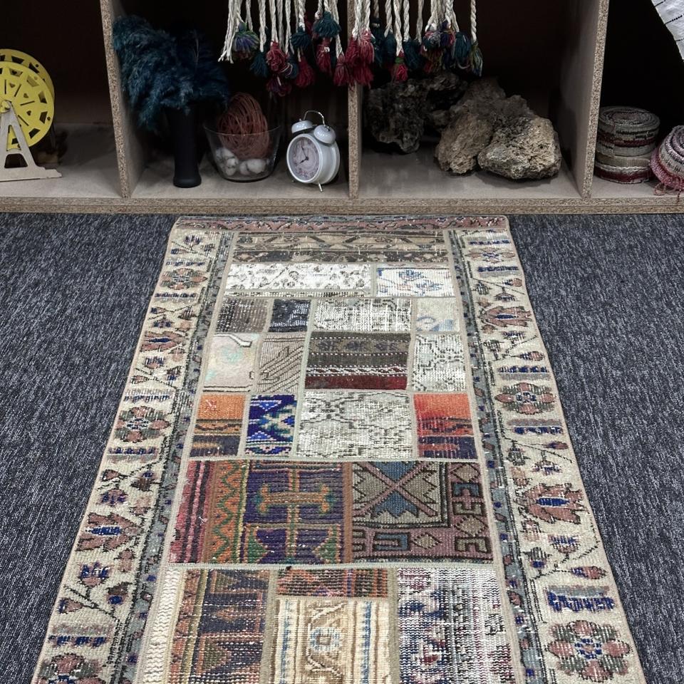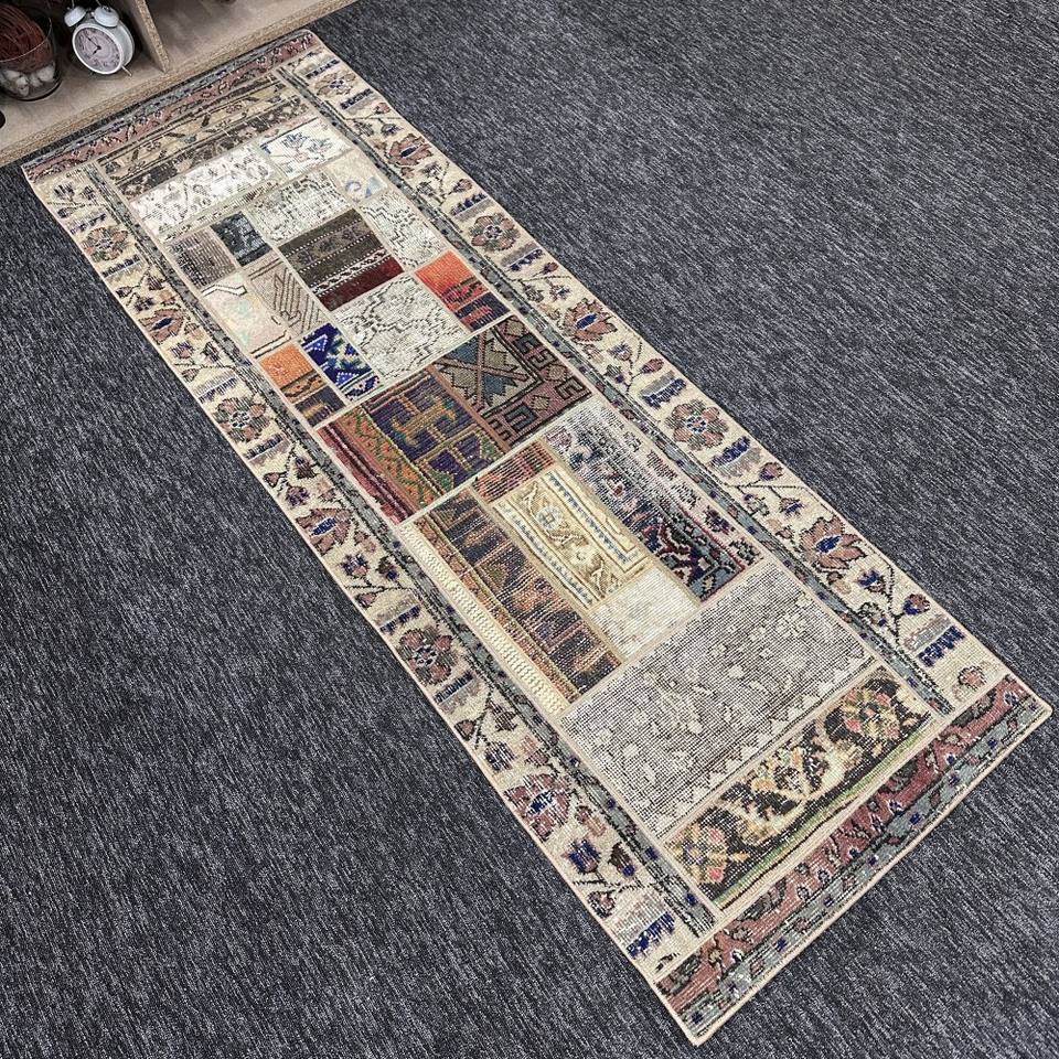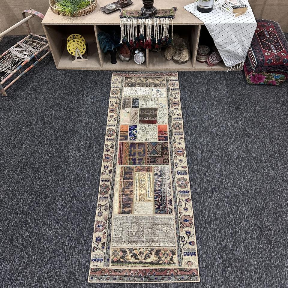 Tapis turc, tapis vintage 2,2x6,6 pieds, tapis en laine beige patchwork arc-en-ciel
