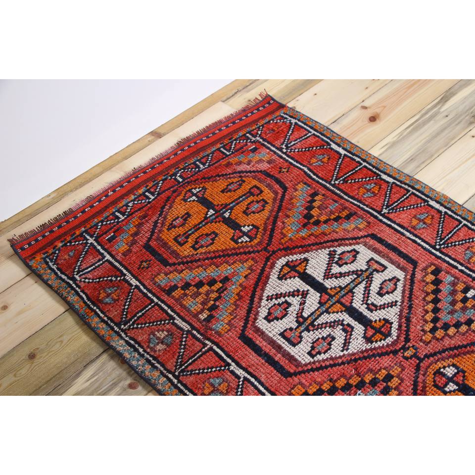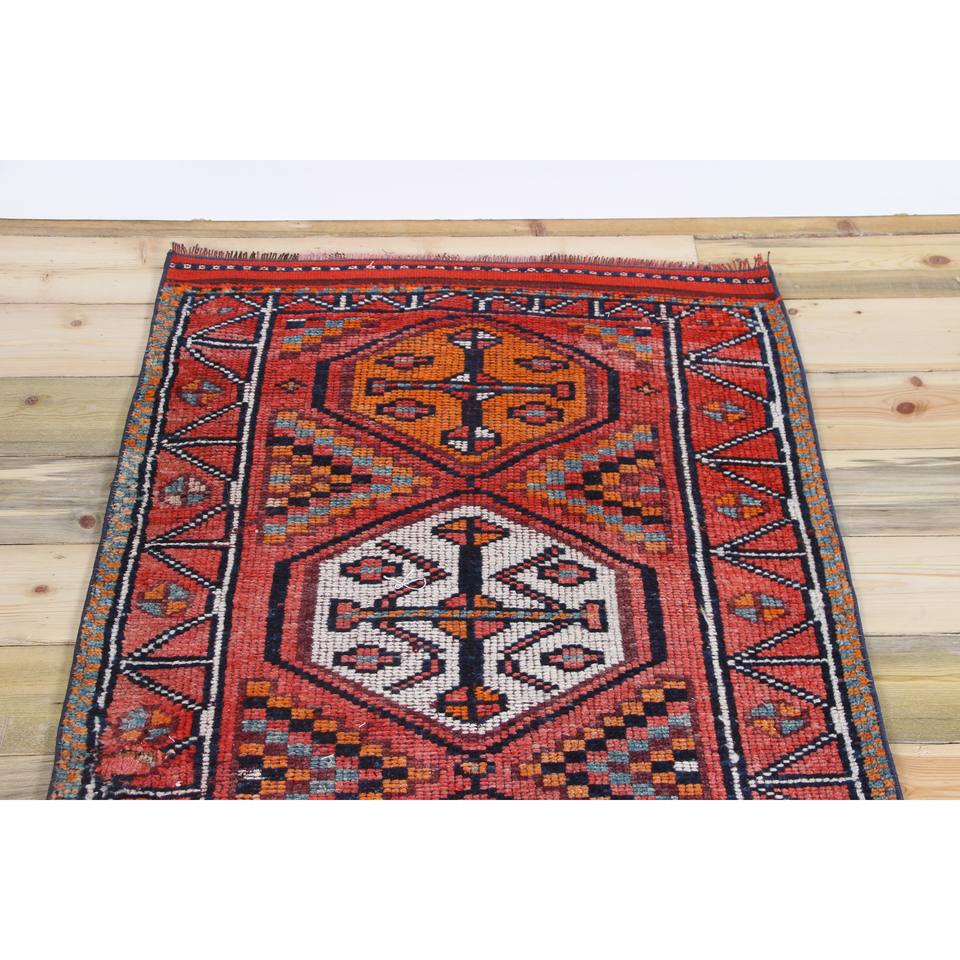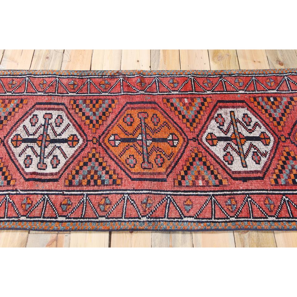 Tapis turc, tapis vintage 2,6x11,4 pieds, tapis en laine géométrique rose orange