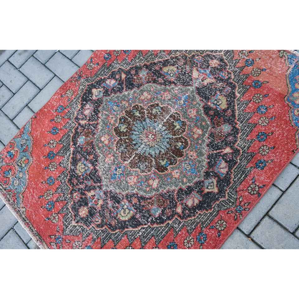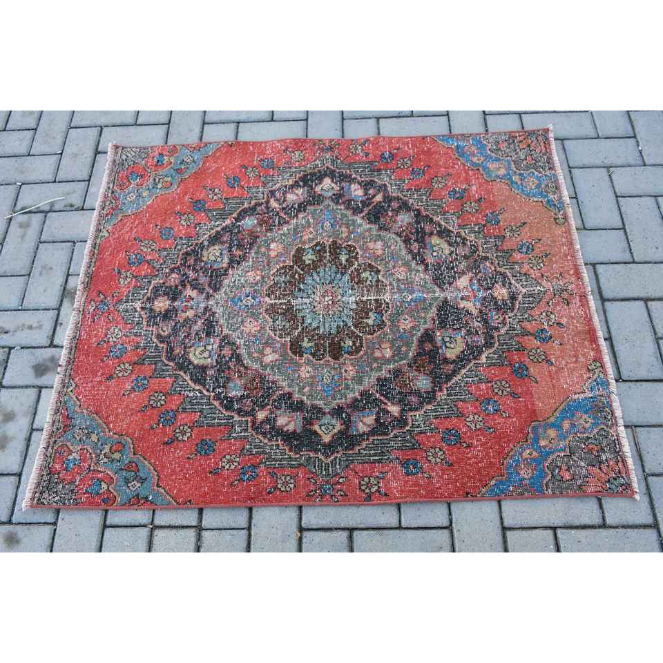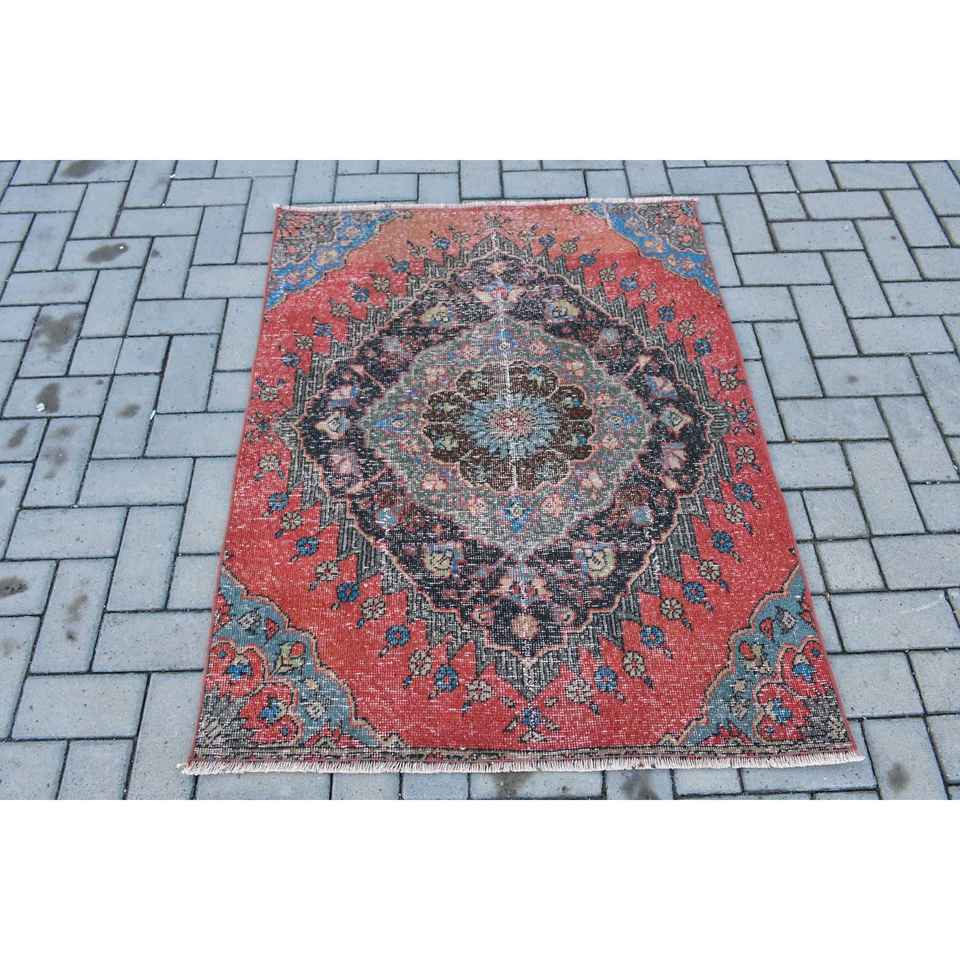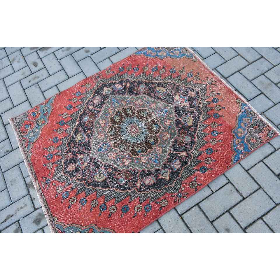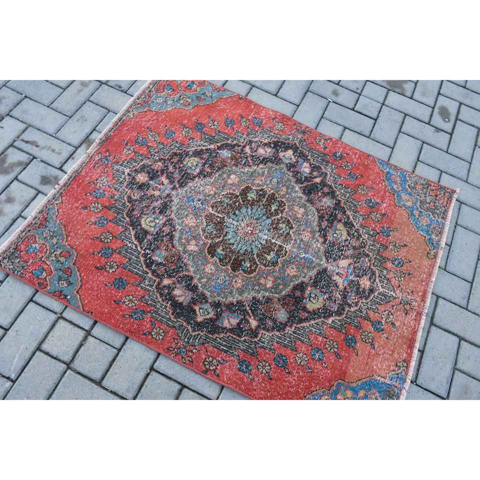 Tapis turc, petit tapis de 3,3 x 4,1 pieds, tapis en laine rouge et bleu
