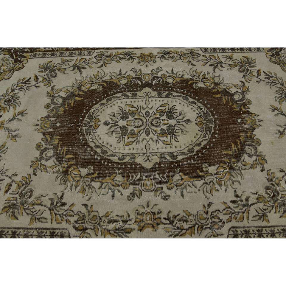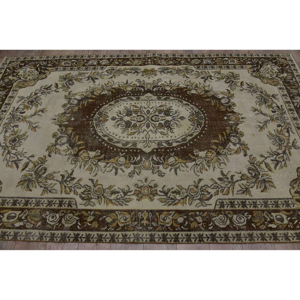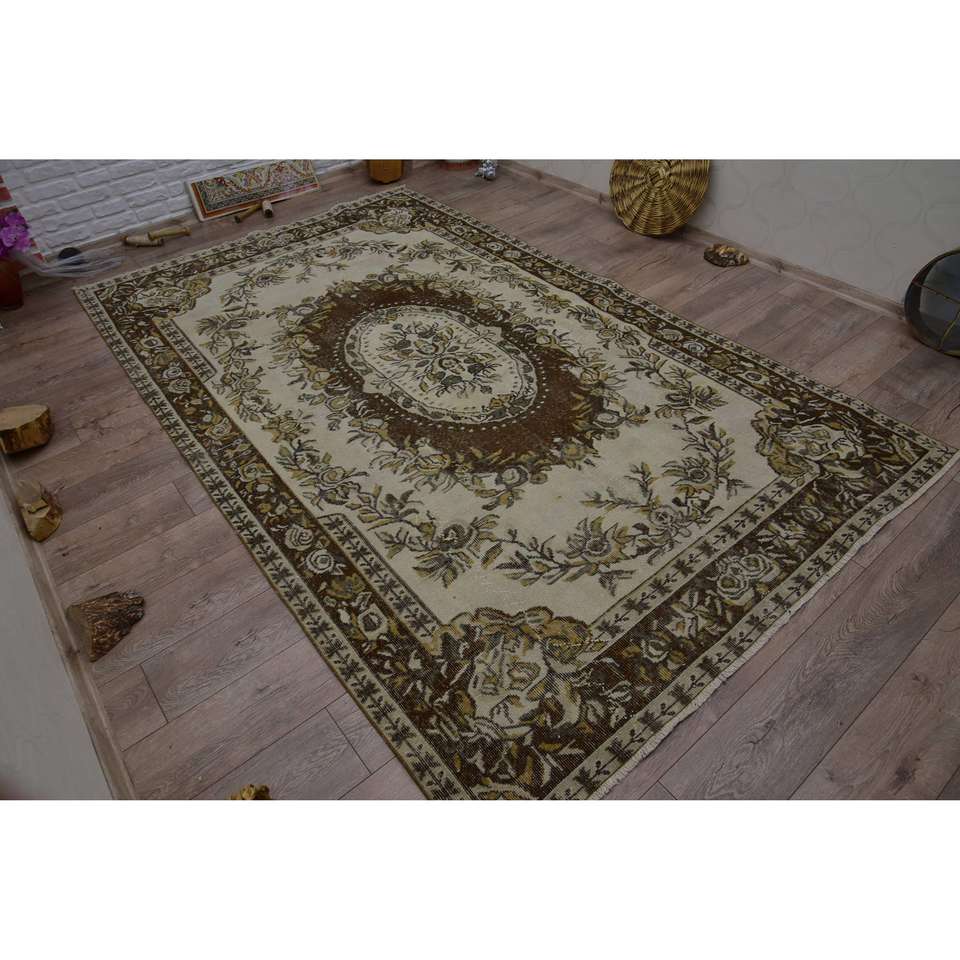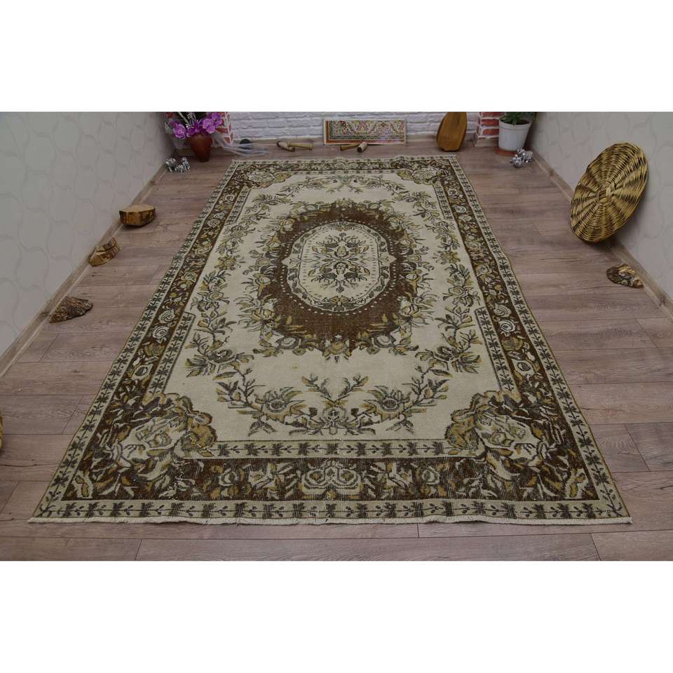 Tapis turc grand format 5,9x9,6 pieds, vintage, écologique, beige, marron, patchwork, en laine, avec envers en latex
