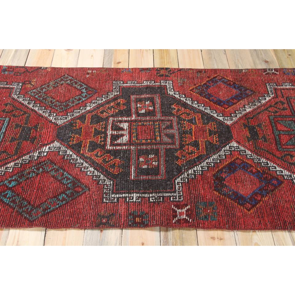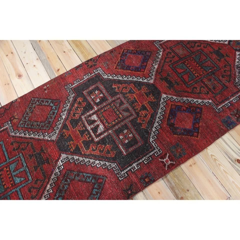 Tapis de couloir en laine turque 3,5x9,6 pi (106x293 cm) Herki rouge patchwork vintage avec envers en latex