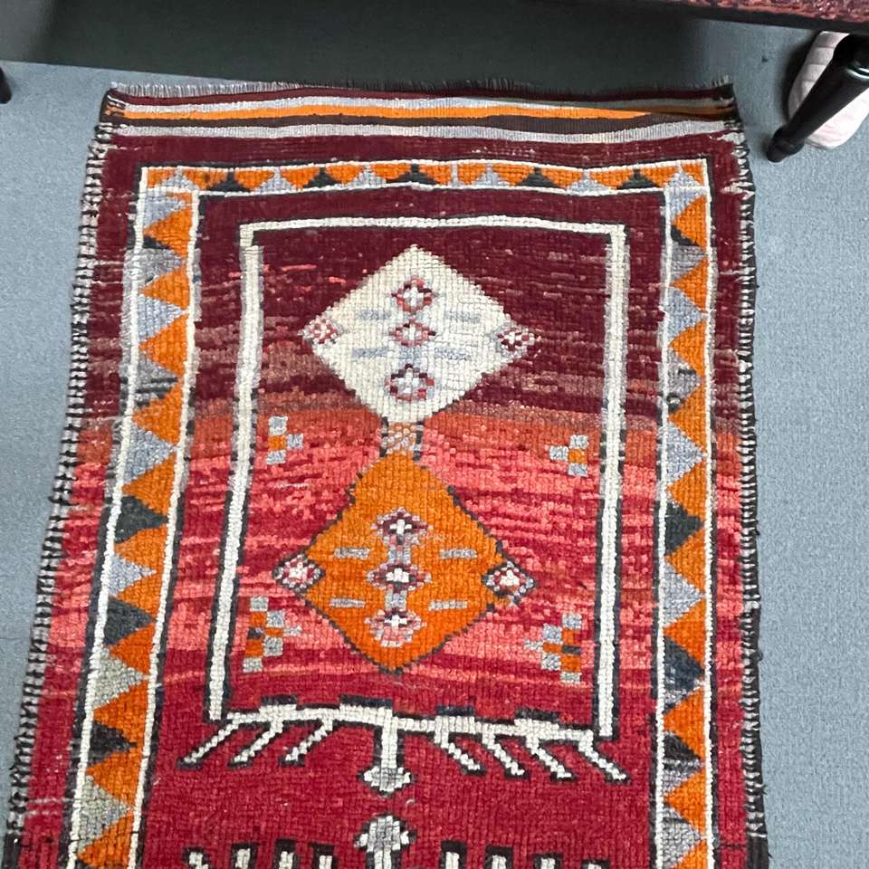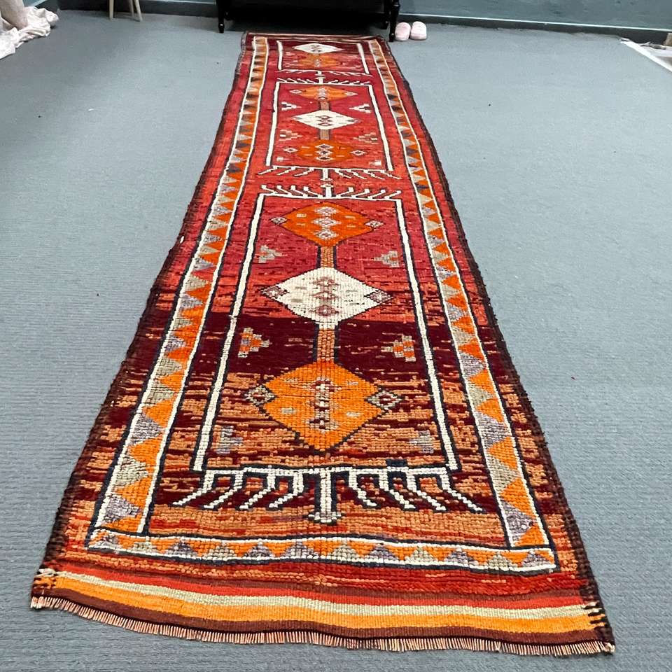 Tapis turc 3x12,5 pi (92x382 cm), motif plantes et arbres rouges, style vintage