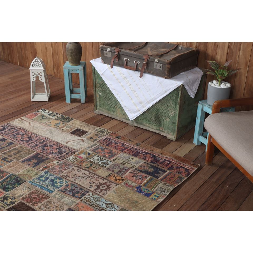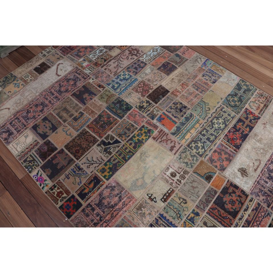 Turkish Vintage Area Rug 5.4x7.4 ft (165x225 cm), Beige Geometric with floral elements Patchwork Rug