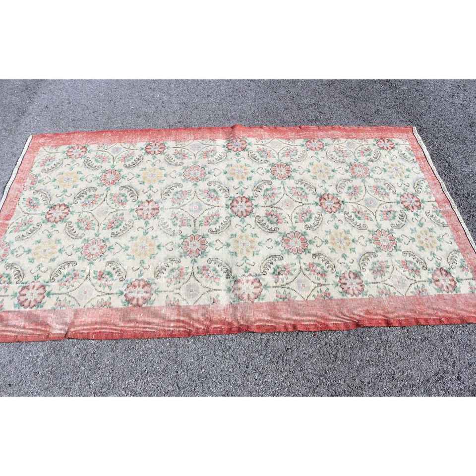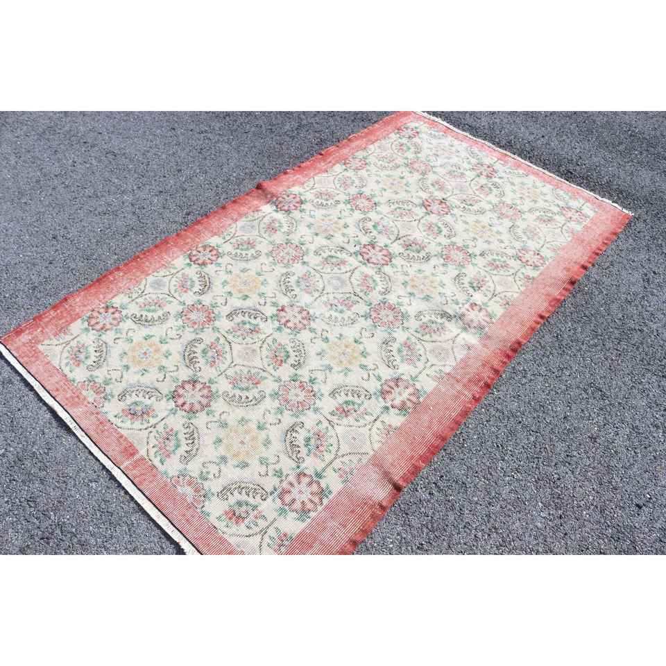 Tapis turc vintage en laine 3,9x6,6 pi (118x202 cm) écologique, patchwork rouge et blanc avec envers en latex