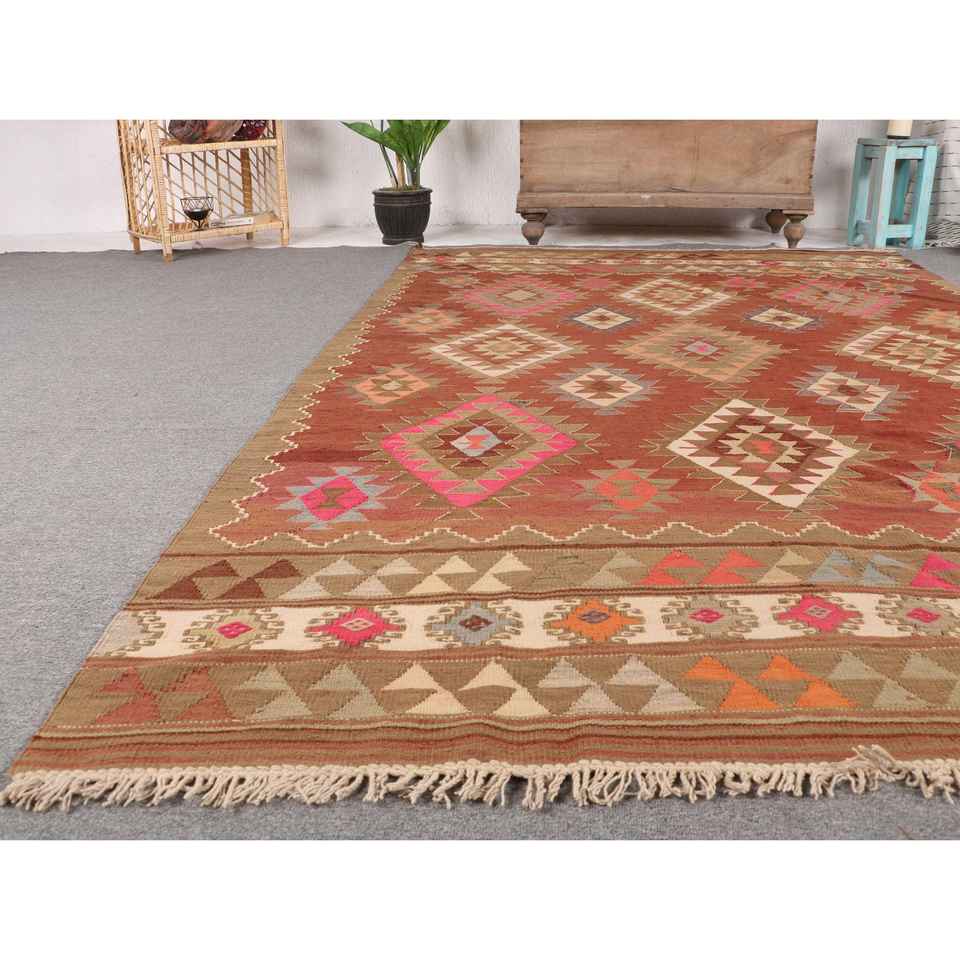 Tapis turc vintage, grand tapis de 5,4 x 8,9 pieds, tapis en laine à imprimé animal brun-rouge
