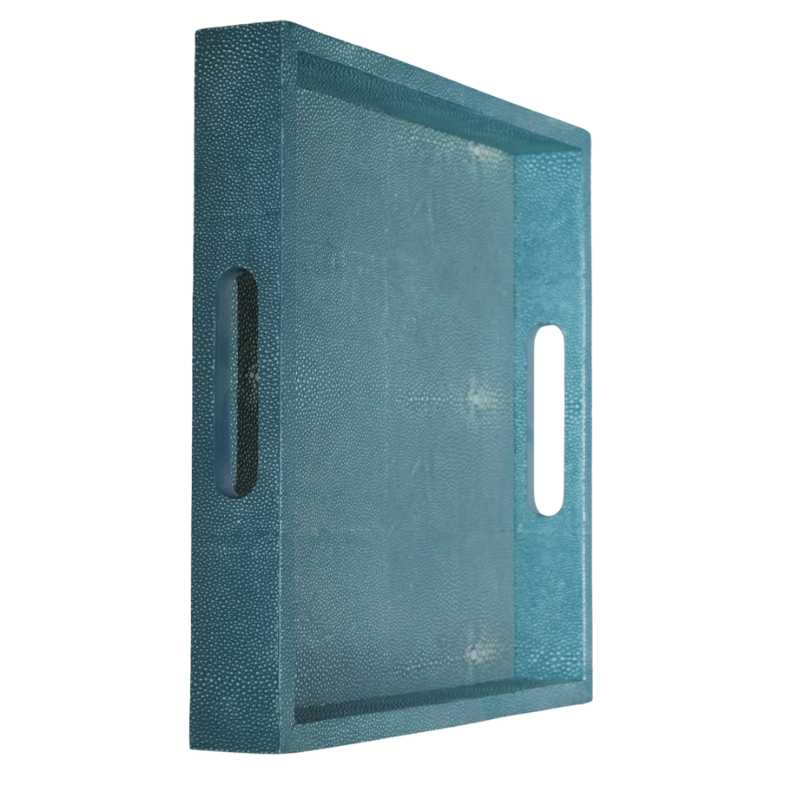 Plateau à thé carré en faux shagreen turquoise de luxe, 0,45x0,45x0,065 mm, pour servir dans les restaurants, les hôtels, les cafés, bords en placage de bois