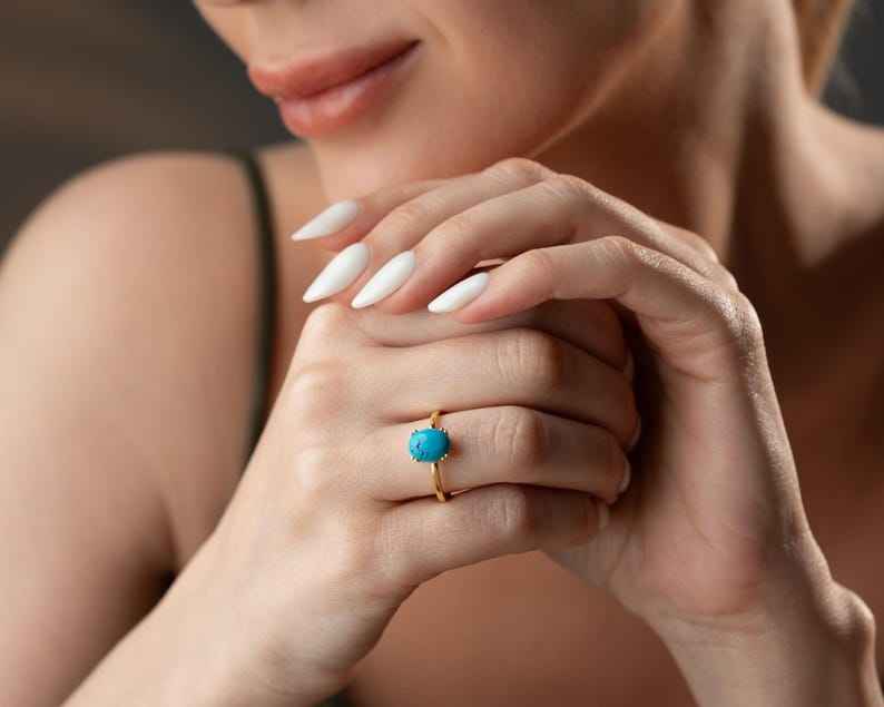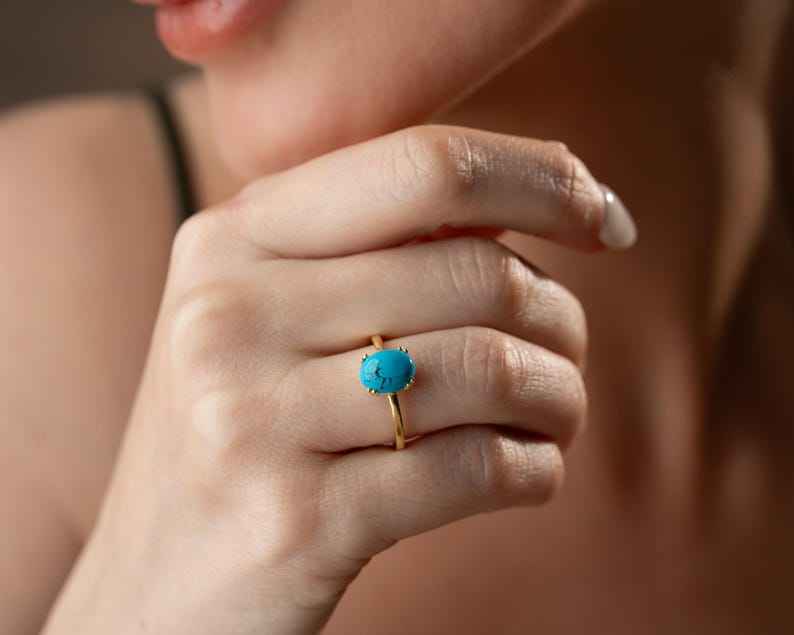 Bague ovale en vermeil turquoise, pierre turquoise bleue, style minimaliste, argent sterling 925 plaqué or 14 carats, bijoux bohèmes faits à la main