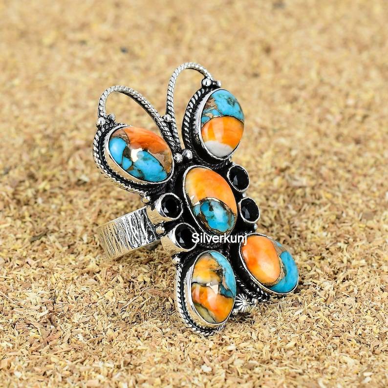 Bague turquoise, bague papillon turquoise huître épineuse, bague vintage en argent sterling, bague en spinelle noire, bijoux inspirés de la nature
