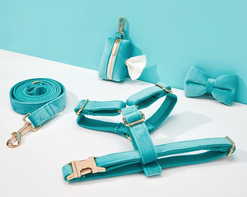 Ensemble de chien et laisse Turquoise Veet, personnaliser le harnais + collier + nœud papillon + porte-sac de caca, faisceau de harnais de mariage sans traction