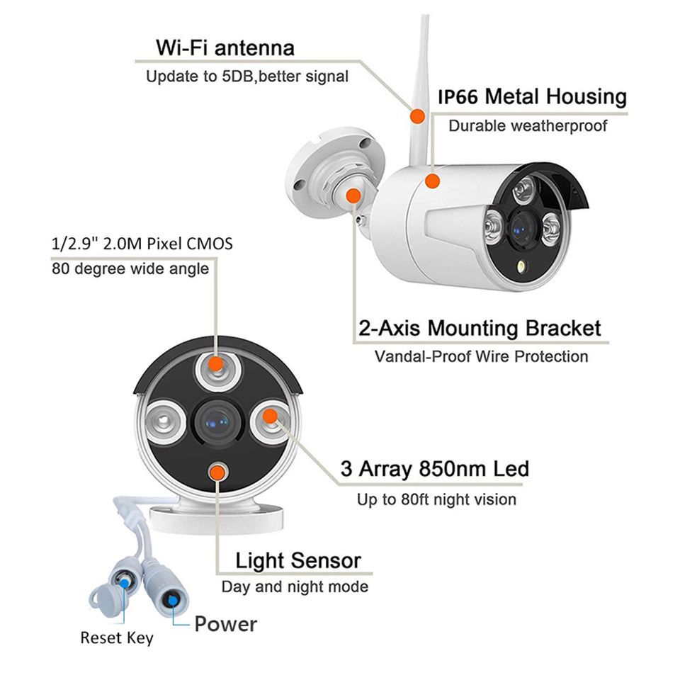 Imperméabilisez/protégez contre les intempéries, Grand Angle, Built-in Sirène, Audio bidirectionnel, Audio à sens unique, À l'épreuve du vandalisme, Bruit anormal de détection, Vision nocturne, Alarme D'E/s, RESET, Micro intégré, Notion de personnes AI