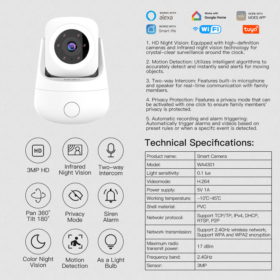 Caméra intelligente WiFi Tuya, caméra de surveillance CCTV, intérieure, 3MP HD, panoramique 360° ° Inclinaison à 180° ° Travail à domicile avec Alexa, Google Home, MOES, automatisation de la maison intelligente