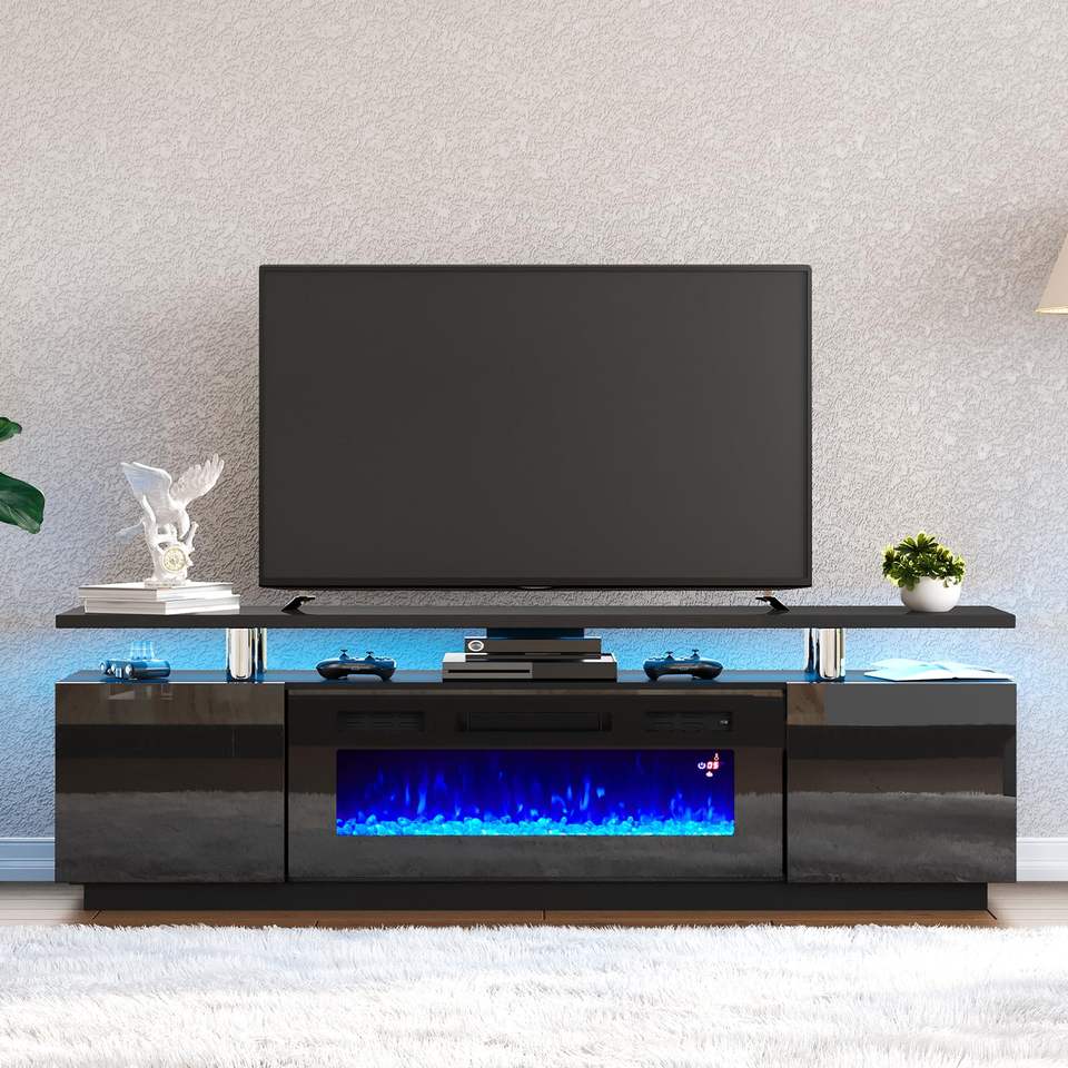 Meuble TV avec cheminée électrique, support TV 75 pouces avec cheminée intégrée, support TV moderne avec télécommande