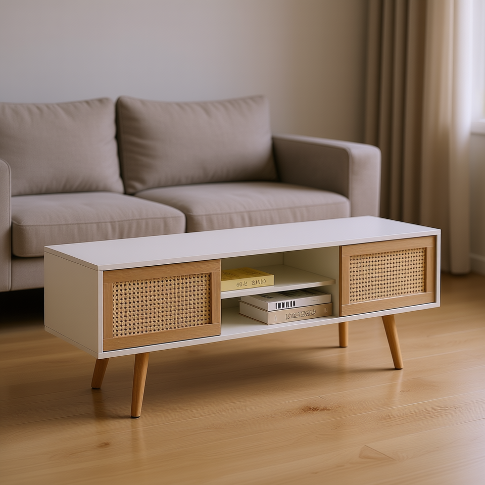 Meuble TV avec finition en rotin, étagère réglable, portes coulissantes doubles, pieds en bois massif, console de salon, meuble de bar à domicile