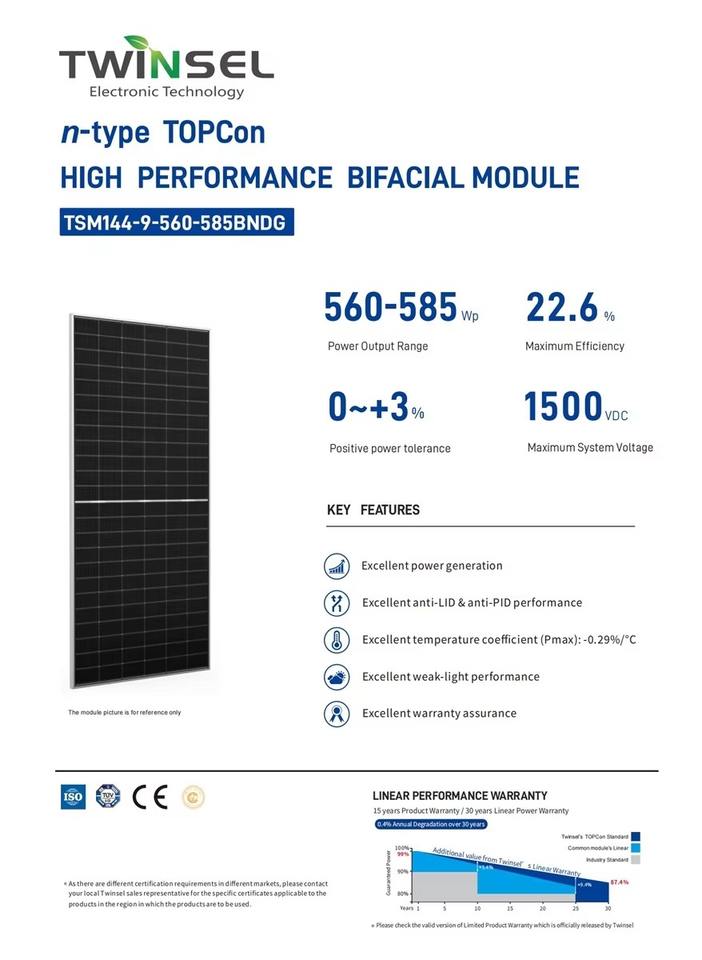 Module solaire Twinsel TSM144-9-560-585BNDG 520W 525W 530W 535W 540W Technologie Mono PERC avec conception à 132 cellules