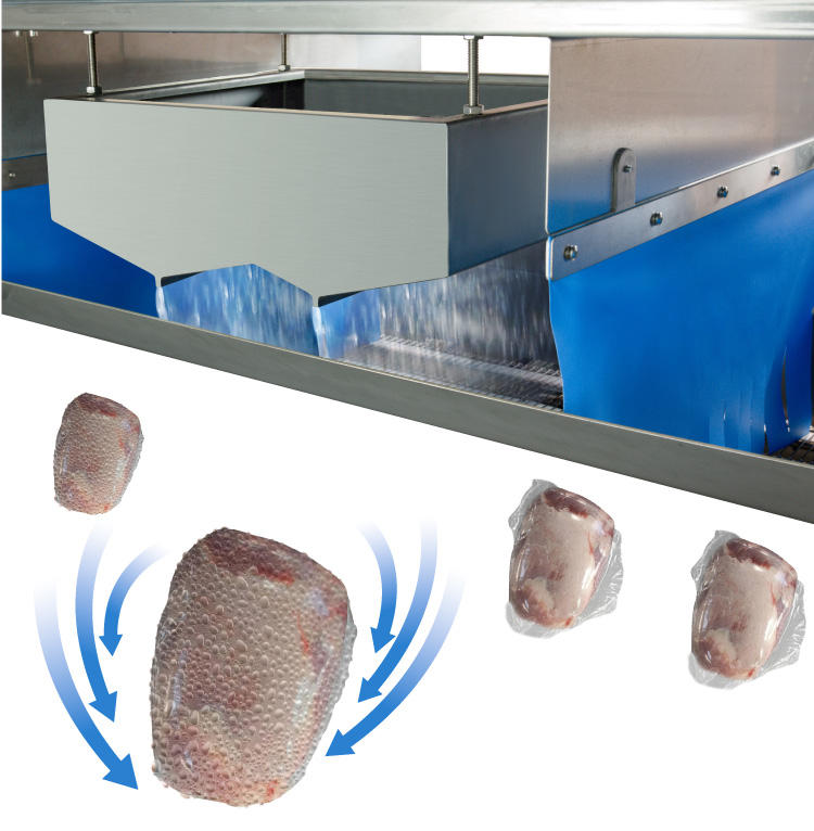 Machine d'emballage sous vide à deux chambres + tunnel de rétraction à eau chaude, pouvant être associée à une ligne de convoyage, pour la viande Wagyu australienne et japonaise de haute qualité
