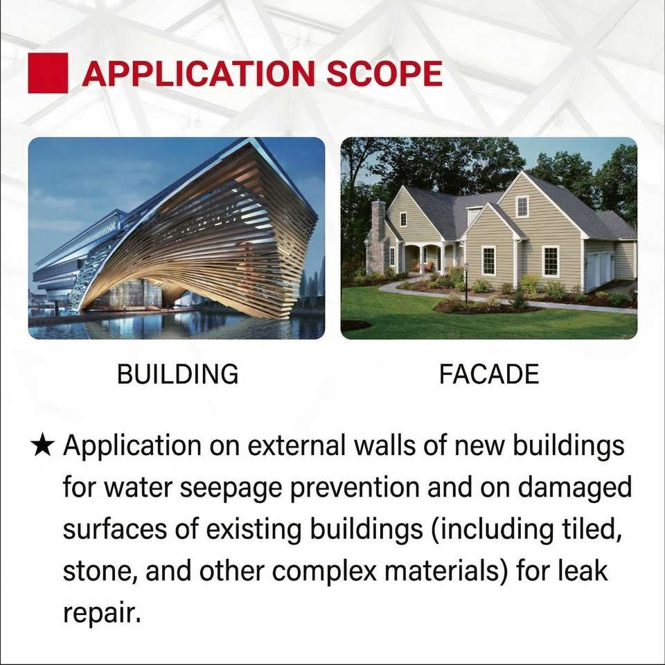 Sol, Piscine, Mur, Toit, Carreau, Villa, Hôtel, Appartement, Immeuble de bureaux, Hôpital, École, Center commercial, Sites sportifs, Installations de loisirs, Supermarché, Sous-sol Tunnel Salle de bain ToitApplication