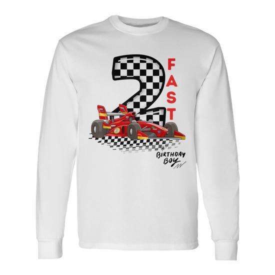 T-shirt blanc à manches longues pour garçon de 2 ans, Two Fast 2Nd Birthday Boy Racing Car