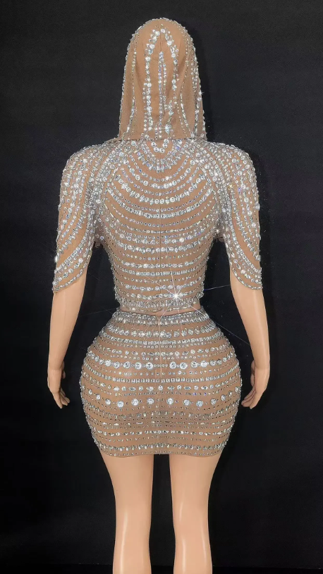 Deux pièces Bling strass vêtements de fête pour les femmes Sexy haut court Mini jupe chute de taille cristal correspondant casquette incluse