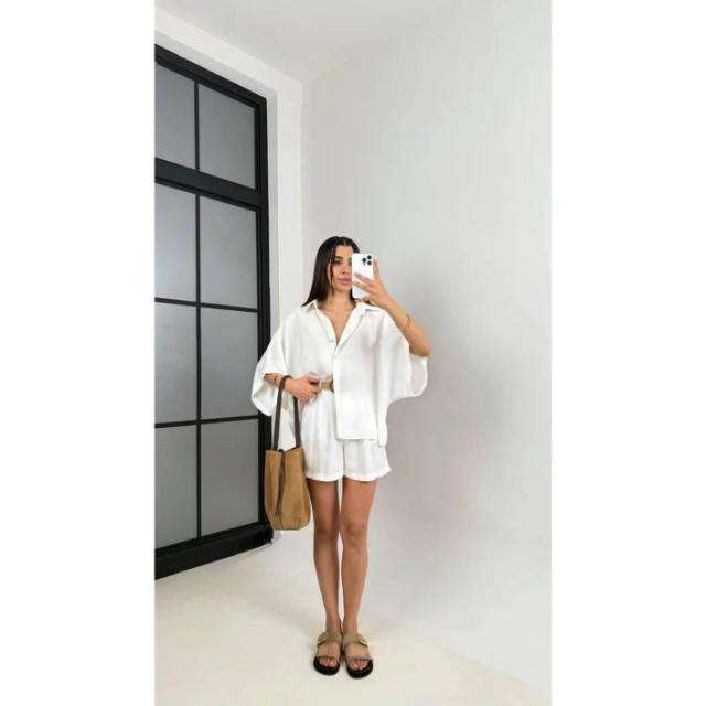 Ensemble deux pièces en lin blanc chemise et short tenue coupe ample Boho Loungewear ensemble deux pièces, short et chemise d'été pour femmes