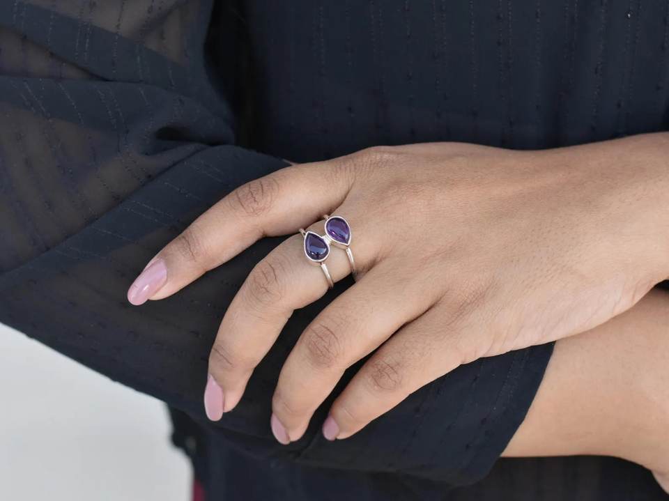 Bague à deux pierres Bague améthyste poire faite à la main Bague en argent sterling 925 Bijoux en pierres précieuses violettes Bague en argent pour femme Boho Cadeau