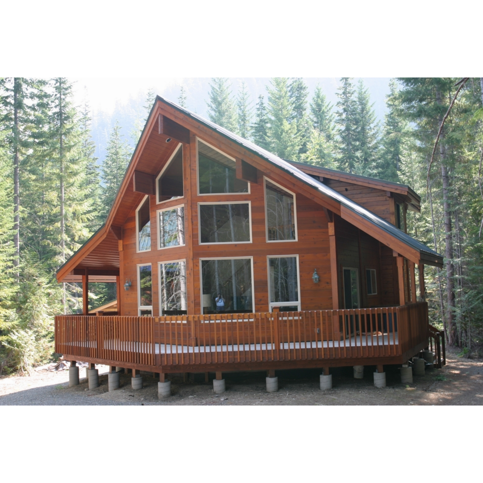 Chalet de montagne préfabriqué en bois contemporain à deux étages, avec grandes fenêtres, terrasse surélevée et structure en bois durable
