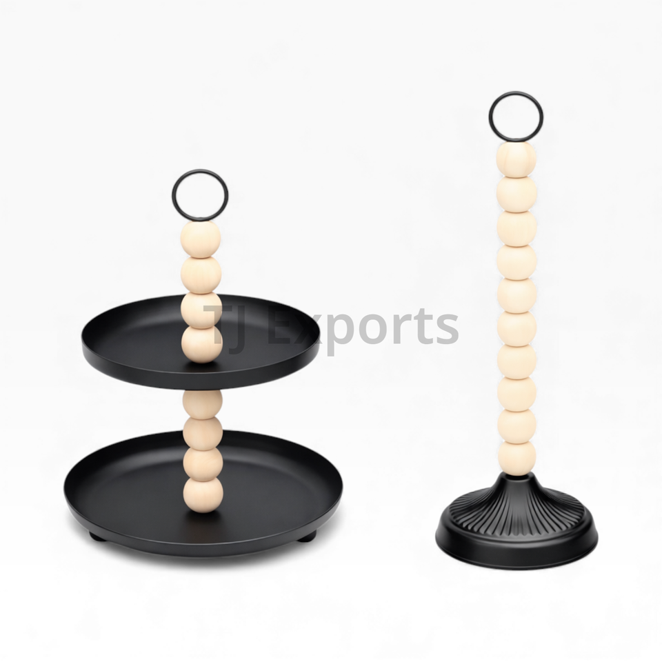 Présentoir à chocolat noir à deux étages avec poignée en perles de bois pour une présentation haut de gamme de desserts et de chocolats