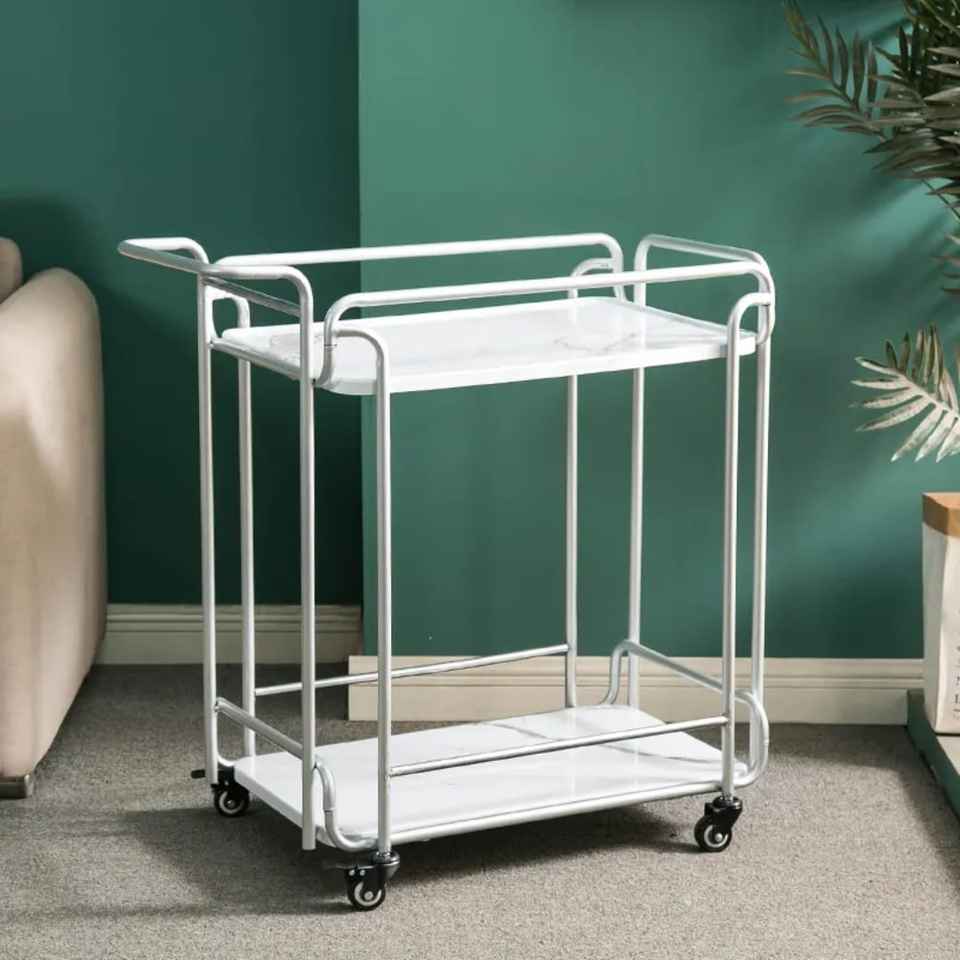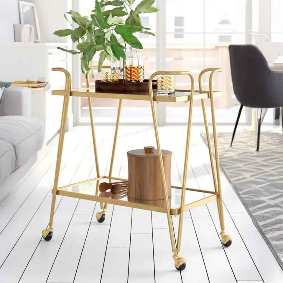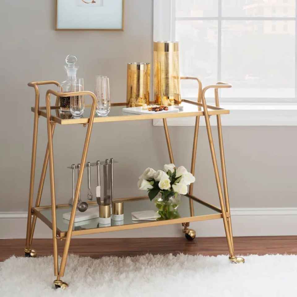 Chariot de bar doré à deux niveaux avec structure métallique et étagères en verre, chariot de service mobile, organisateur de rangement moderne et luxueux, élégant pour la maison