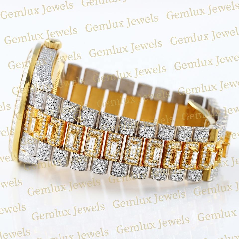 Montre Hip Hop pour hommes deux tons plaquée or jaune 14 carats Baguette cloutée diamants Moissanite glacés