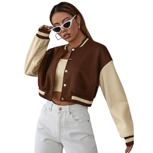 Blouson aviateur en cuir véritable pour femme, style universitaire, deux tons, court, marron, pour streetwear, broderie