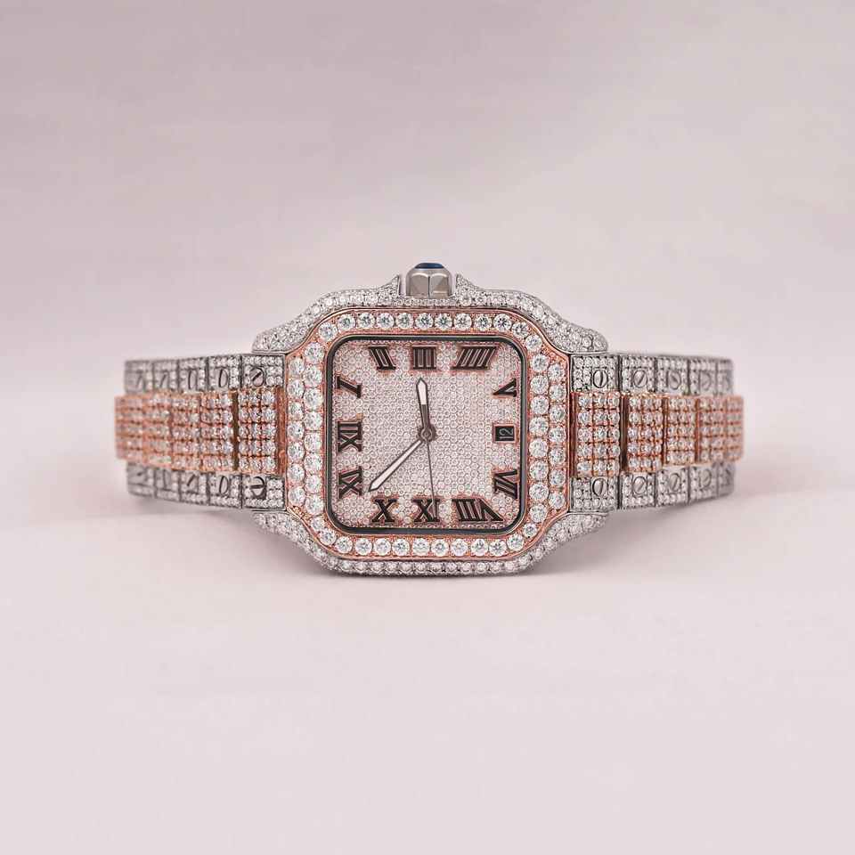 Montre unisexe en acier inoxydable à mouvement automatique avec cadran en verre de diamant moissanite personnalisé bicolore, tourbillon, diamant VVS, style hip-hop