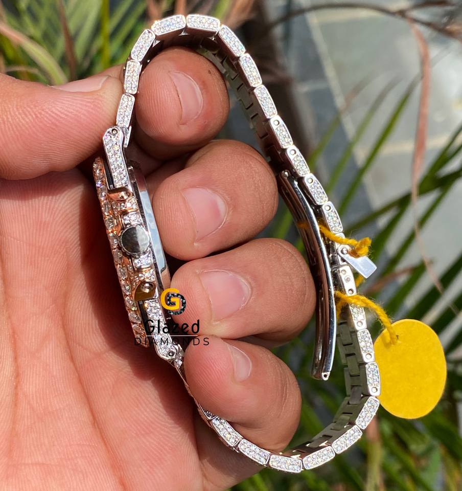 Montre intelligente deux tons de luxe pour hommes VVS Clarity Moissanite Diamants Entièrement glacé Brillant en acier inoxydable avec cadran en verre